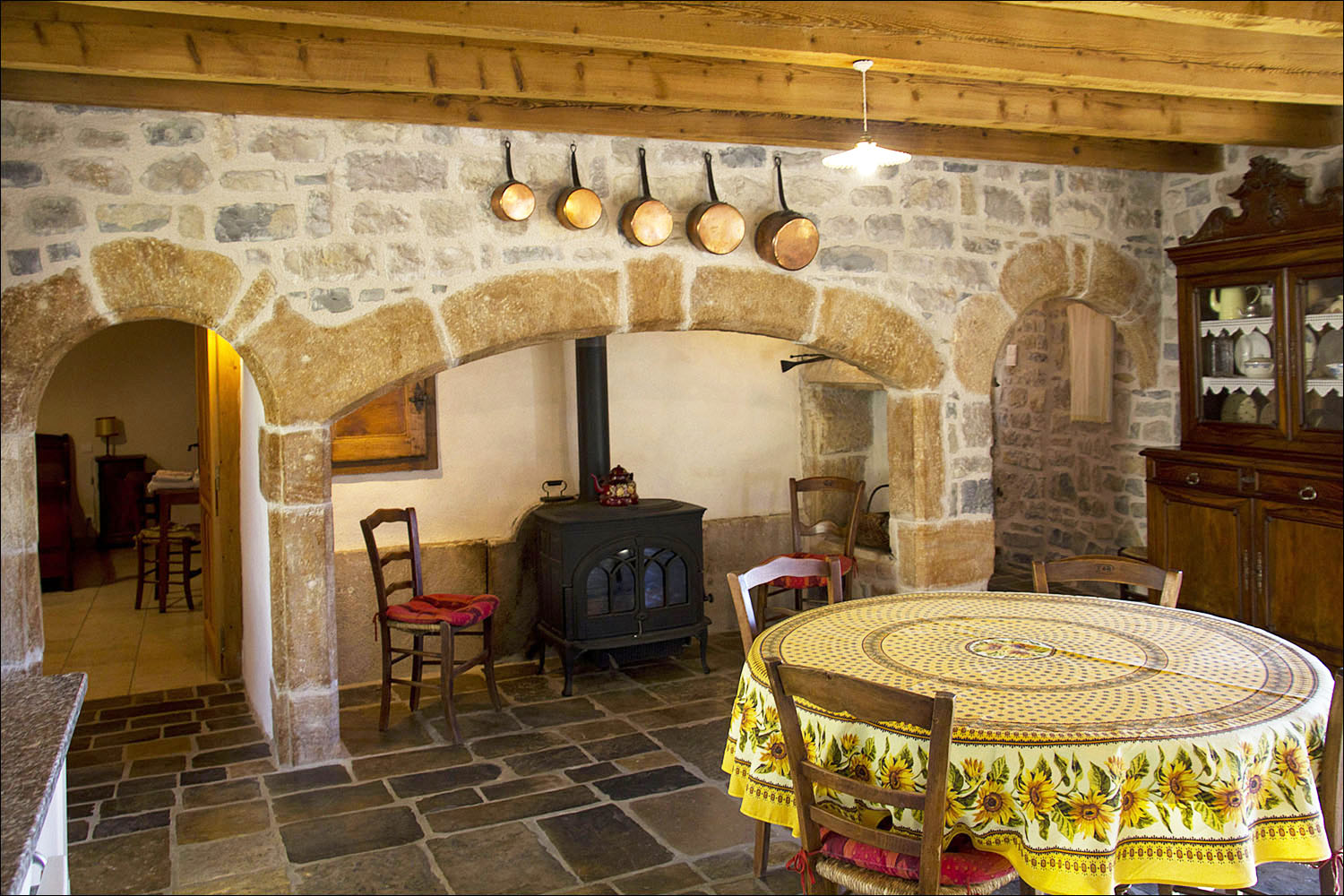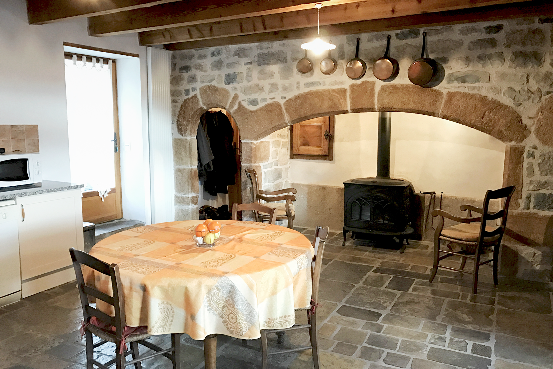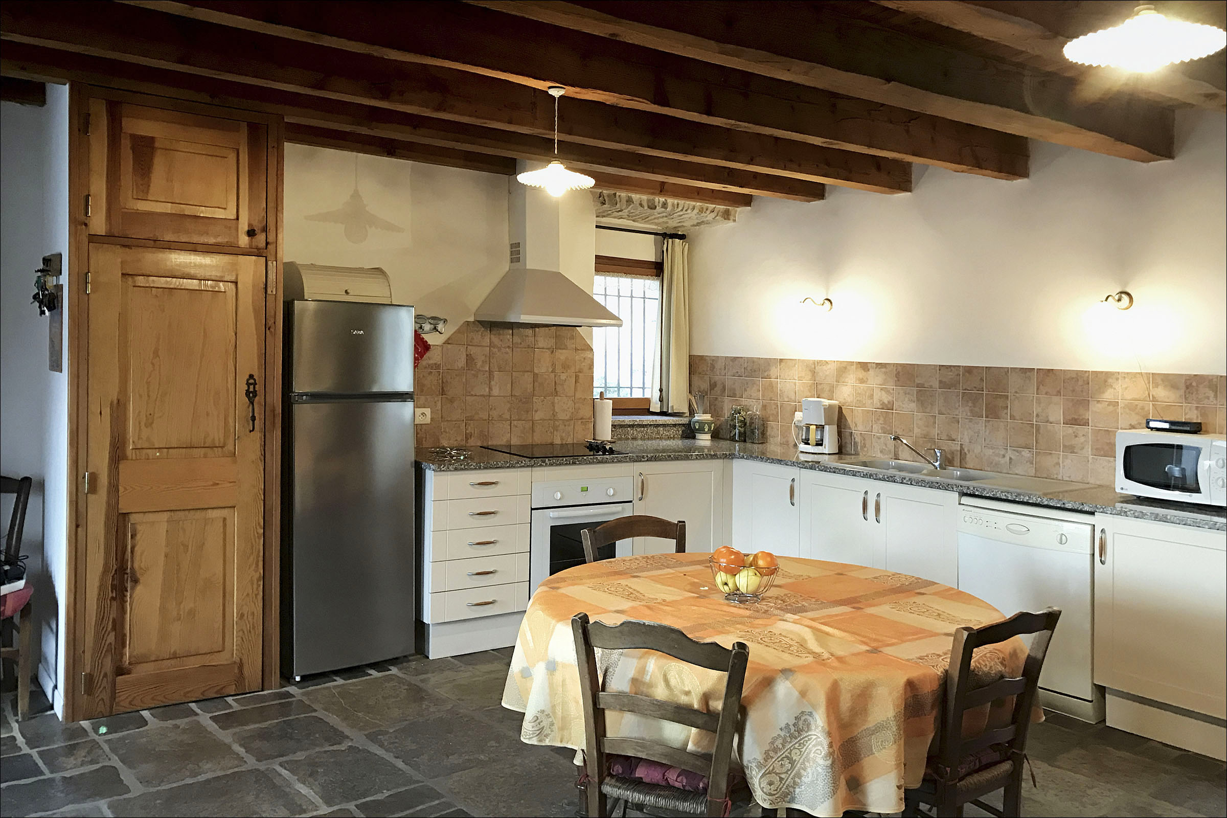 - Entrée/Salle de vie - Salle à manger avec cheminée ancienne et cuisine intégrée (30 m²) comprenant lave-vaisselle, four électrique, micro-onde, réfrigérateur congélateur, plaques vitrocéramiques sur un sol en pierre calcaire.