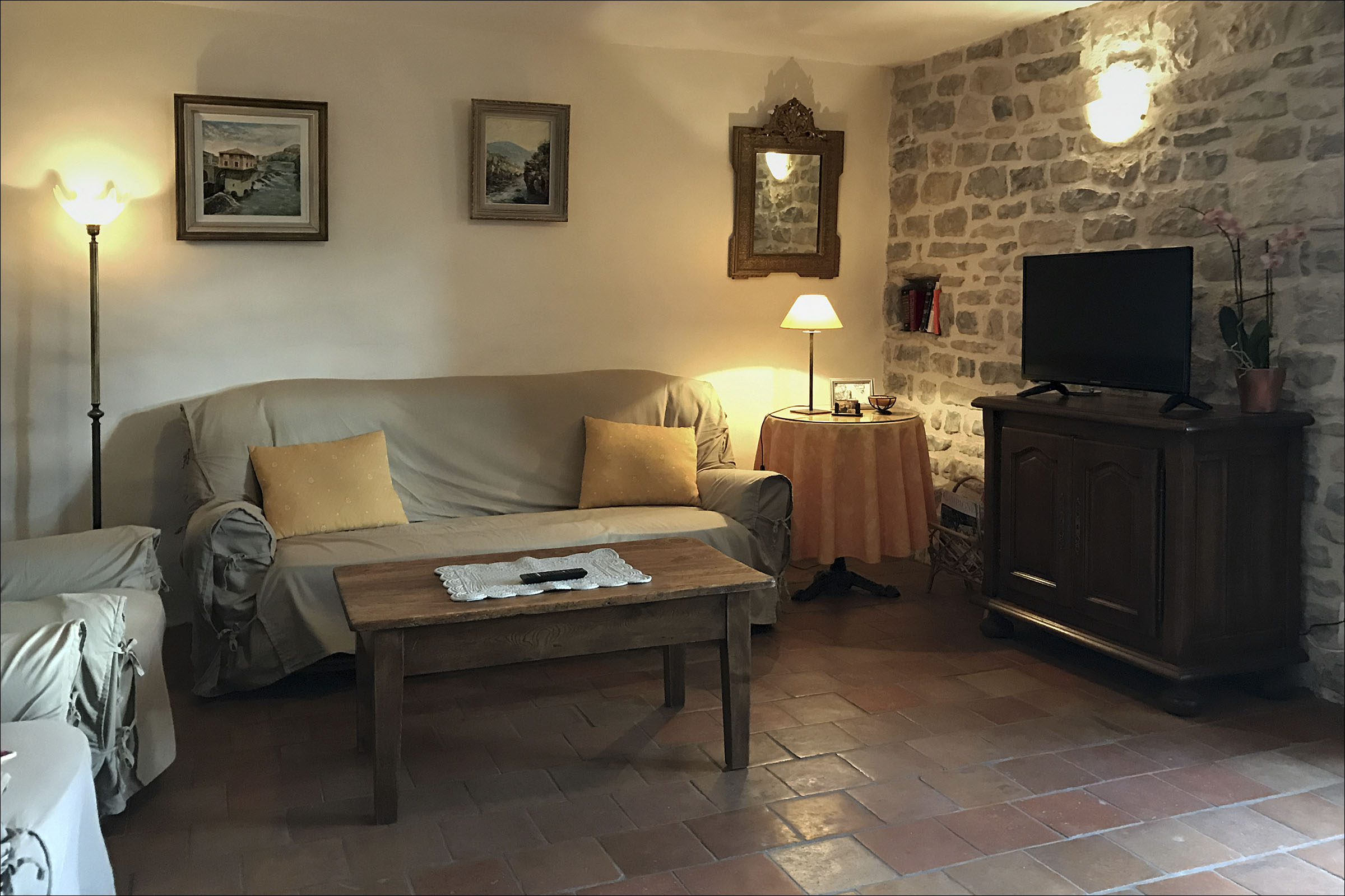 - Salon (21 m²) avec canapé, fauteuils, table basse et télévision, sol terre cuite. Orienté Sud, il offre un très beau panorama sur le village et la vallée .